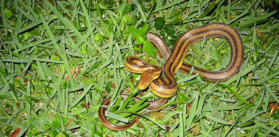 The brown water snake is a large non-venomous snake that can grow at 32-64 inches. They have a bulging jaw and a flat head; therefore, some people will think that they are venomous. The eyes that are protruding above their head makes them look like a frog. This snake prefers to live close to bodies of water. They are shy and will often be seen basking on the limbs of the trees that overhangs on water. When the snake is disturbed, it will immediately drop on the water.